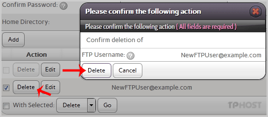 4. Under the Action list, select the appropriate FTP Account and then click on the Delete button.