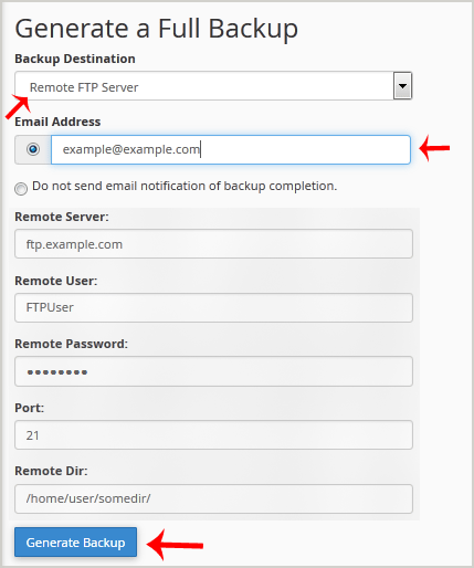 5. Once you fill in the Remote FTP details, click on the Generate Backup button.