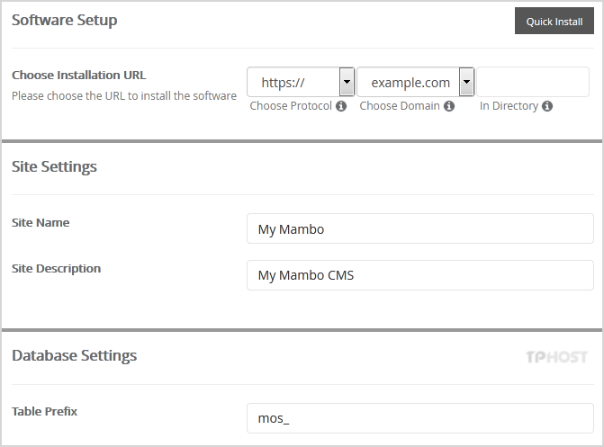 Note: Copy the admin username and password on a notepad because you will need these login details to access the admin area of your Mambo Website.